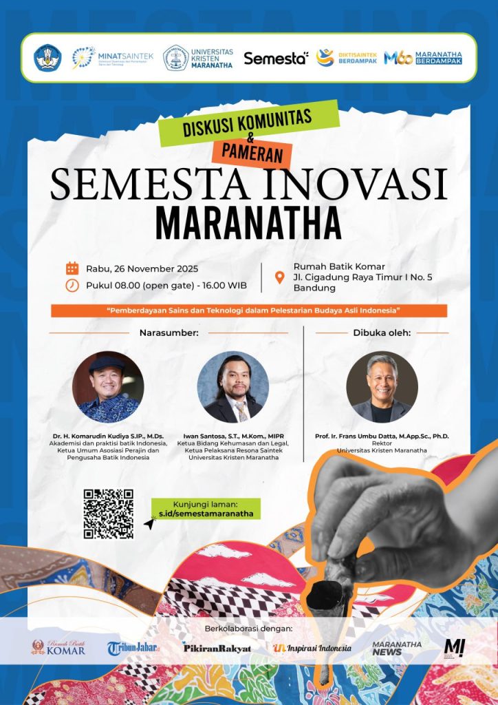 Kegiatan Diskusi Komunitas (FGD) & Pameran Semesta Inovasi Maranatha yang akan diadakan pada hari Rabu, 26 November 2025 bertempat di Rumah Batik Komar, Bandung, adalah bagian dari rangkaian program tersebut. Topik yang diangkat adalah “Revitalisasi Batik Lokal dan Naskah Kuno Karya Seni Tradisi Melalui Pemanfaatan Sains dan Teknologi yang Berkelanjutan”.